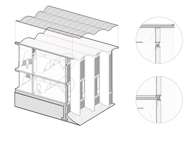 Structurally, the building is made of parallel load-bearing walls with large arched openings. The vaulted ceilings enable high spaces to ventilate hot air, double-shells for isolation in summer and winter, and space to locate air conditioning ducts.
