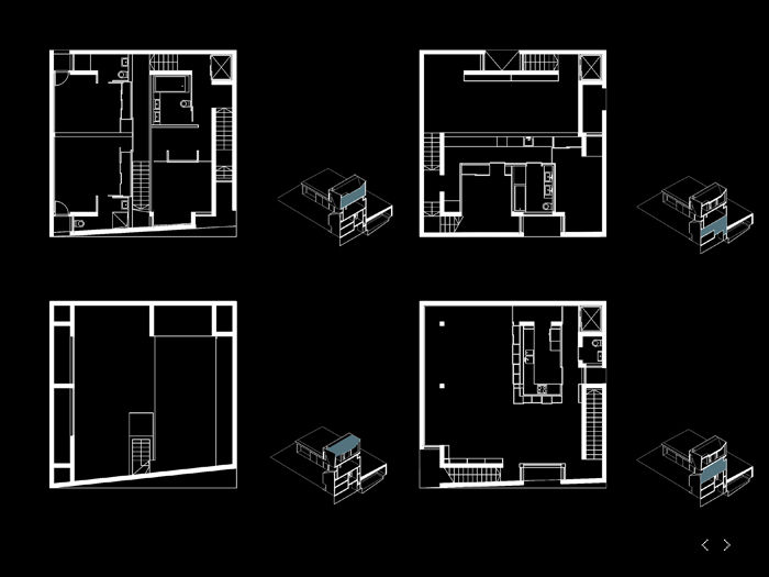 Twice House’s survivalist attitude extends from the structuralist 50/50 split to a tectonic binary system of walls. This system wraps the vertical house and roofs the horizontal house with a meter deep buffer space that tempers the inner climate, diffuses natural light, controls the interior and exterior views and designates vertical circulation at the fringe.