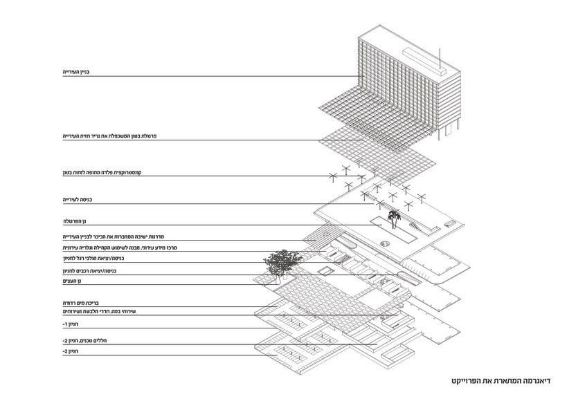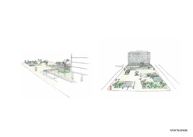 The current, large-size balcony does not function, possibly has never functioned, as an elevated ceremonial entrance plaza to the City Hall and remains an empty and bare structure that obstructs contiguity and movement between the square and the City Hall. It requires a transformative measure. We propose to turn it into a shaded terrace with a voluptuous garden (corresponding to Gan Yaakov at the other end ofChen Boulevard) and to reinstate the original main entrance of the City Hall on the balcony. Easy public access to the balcony is ensured by several additional circulation elements such as escalators (aligning the building’s façade on the North-East corner of the balcony, leading the visitor straight to the main entrance along a new, integrated security checkpoint) and a spacious spiral staircase (on the South-East side of the balcony) as well as a handicapped accessible elevator - together connecting all (under- and above ground) levels to one-another.